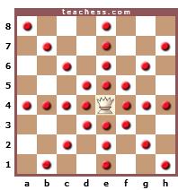 Seu dominio das casas é 21 como mínimo e 27 como máximo. O estudante pode conferir isto no seu próprio Tabuleiro. Colocar uma Dama em diversas posições para ver seus possíveis movimentos.